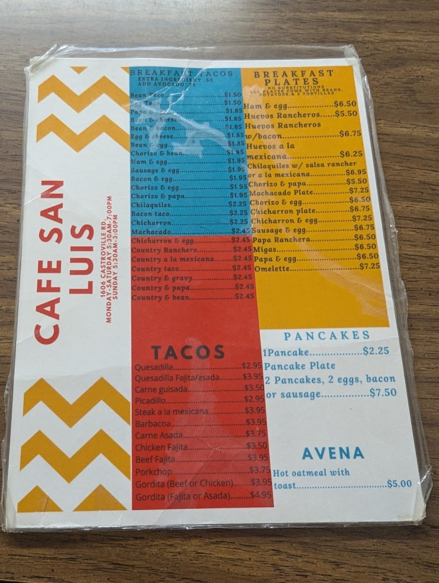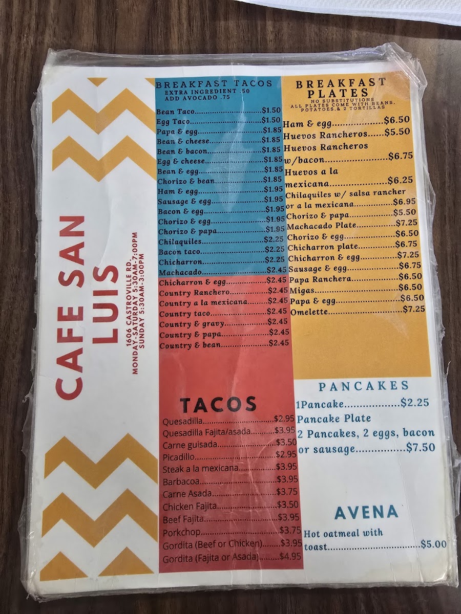 Introducing the menu at Cafe San Luis, a beloved Taiwanese eatery nestled in the heart of San Antonio. Located at 1606 Castroville Rd, this charming café offers a nostalgic neighborhood vibe, reminiscent of comforting childhood meals. Diners rave about the mouthwatering enchiladas and robust barbacoa, with many patrons—like Ricky Adames—visiting multiple times a week for the consistently delicious offerings.